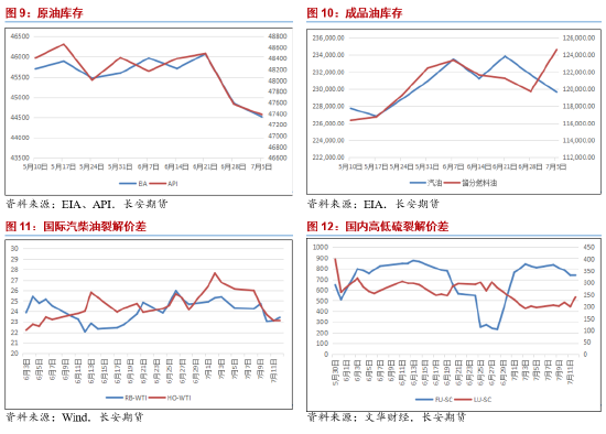 库存侧,原油方面,美国至7月5日当周API原油库存录得减少192.3万桶,前值为减少916.3万桶,预期为减少25万桶;同时7月5日当周EIA原油库存录得减少344.3万桶,前值为减少1215.7万桶,预期为减少133.3万桶,库存水平降至2024年3月15日以来最低。两大原油油库存的再度去库对油价在近期形成了一定的支撑,这也在侧面表明了市场的消费正在进一步回暖。而在成品油方面,美国至7月5日当周汽油库存则录得为减少200.6万桶,前值为减少221.4万桶,预期为减少,60万桶;同时精炼油库存则增加488.4万桶,前值为减少153.5万桶,预期为增加83.3万桶。成品油的角度来看,汽油产量在上周时间有所增加但库存下降,这进一步表明出行消费正在逐步回暖,但精炼油产量下降而库存增加则表明化工需求或依然疲软,此二者的结合或导致内盘成品油的价格进一步有所走强。