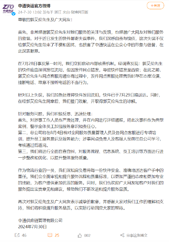 @中通快运官方微博 今日发文致歉:对于近日发生的快件邮寄失误事件,我们深感自责与愧疚,这次失误不仅给郭艾伦先生带来了不便和困扰,也损害了中通快运在公众心中的形象与信誉,在此深表歉意。已登门致歉,并取得郭艾伦先生的谅解。中通快运还称,对涉事工作人员作严肃处理,并在内网进行详细通报,将此次事件作为典型案例,警示全体员工加强服务意识和责任心。