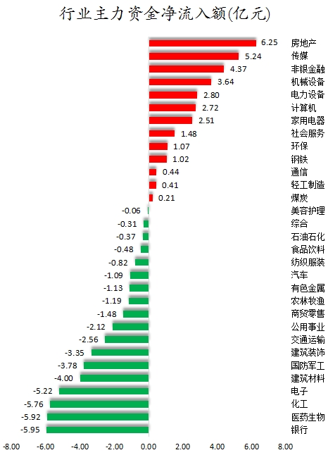 从行业来看,申万所属的31个一级行业,今日有13个行业主力资金呈现净流入,其中,房地产行业主力资金净流入最多,净流入金额为6.25亿元;行业主力资金净流入居前的还有传媒、非银金融、机械设备,净流入金额分别为5.24亿元、4.37亿元、3.64亿元。18个行业主力资金呈现净流出,其中,银行行业主力资金净流出最多,净流出金额为5.95亿元;行业主力资金净流出靠前的还有医药生物、化工、电子、建筑材料、国防军工,净流出金额分别为5.92亿元、5.76亿元、5.22亿元、4亿元、3.78亿元。