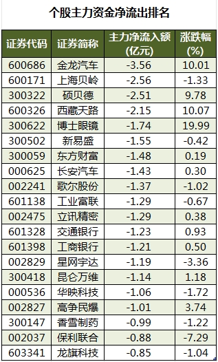 此外,2800只个股被主力资金净卖出,其中,17股被主力资金净卖出超1亿元。主力资金净流出最多的个股是金龙汽车(600686),净流出金额为3.56亿元;主力资金净流出居前的个股还有上海贝岭(600171)、硕贝德(300322)、西藏天路(600326)、博士眼镜(300622)、新易盛(300502),净流出金额分别为2.56亿元、2.51亿元、2.15亿元、1.74亿元、1.55亿元。
