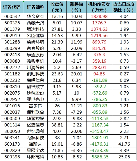 盘后龙虎榜数据显示,今日机构席位资金合计净卖出约1.49亿元。其中,净买入的个股10只,净卖出的个股13只。机构净买入最多的股票是华金资本(000532),净买入金额约1828.98万元;机构净买入的还有西藏天路、腾达科技等股。机构净卖出最多的股票是沐邦高科,净卖出金额约5886.35万元;机构净卖出居前的还有星网宇达(002829)、福斯达、龙旗科技等股。