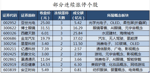 截至收盘,沪深两市合计3713只个股上涨,1201只个股下跌,平盘个股175只,停牌的个股13只。不含当日上市新股,共有54只个股涨停,11只个股跌停。连续涨停天数看,亚世光电(002952)、博士眼镜、西藏天路、金龙汽车均已连收3个涨停板,连续涨停板数量最多。