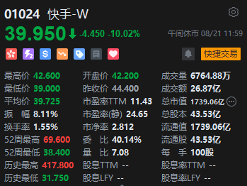 快手大跌逾10%。快手公布截至6月底止第二季度非国际财务报告准则经调整利润录46.79亿元人民币,高于市场预期,惟花旗发表研报指,快手次季GMV增幅放缓至15%,预期受到宏观经济持续疲弱及市场竞争加剧的影响,其GMV增幅可能于下半年持续走低,目前预测下半年GMV增幅为14%,或拖累电商广告及其他服务收入增长。