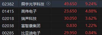 苹果概念股逆势上涨,舜宇光学科技涨超9%。该公司公布2024年中期业绩,收入约188.6亿元,同比增加约32.1%;毛利约32.465亿元,同比增加约52.4%;毛利率则约17.2%,同比增加约2.3个百分点。公司股东应占期内溢利约10.79亿元,同比增加约147.1%。