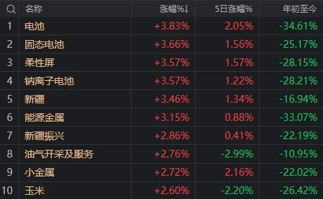 从涨幅来看,新能源赛道是日内最强。具体则有电池、固态电池、钠离子电池和风电等多个方向走强。
