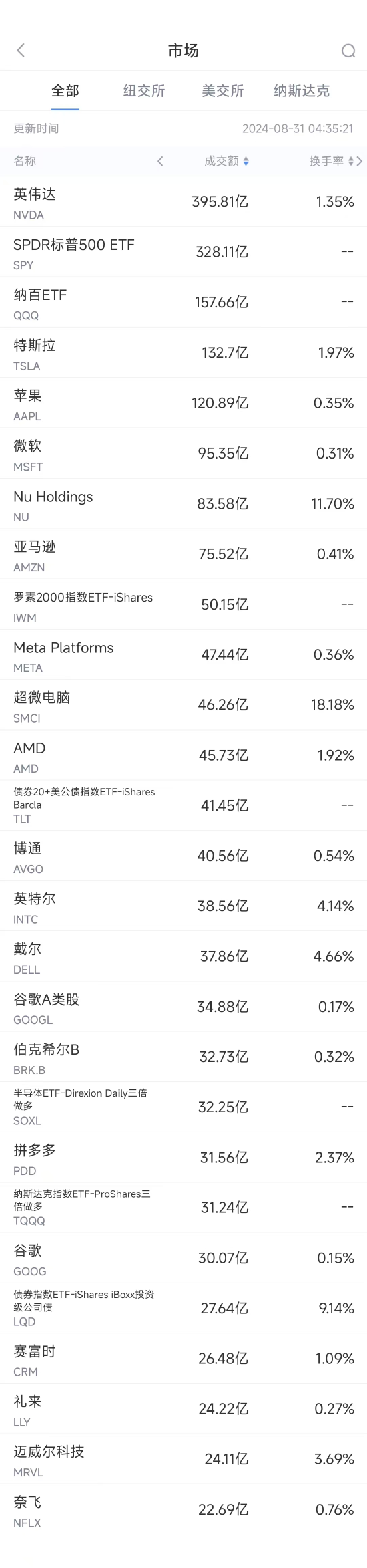 第5名Nu Holdings收高5.20%,成交83.58亿美元。Nu Holdings是拉美地区金融科技独角兽、巴西数字银行Nubank母公司。该股在8月份上涨超过18%,今年迄今已上涨约80%。
