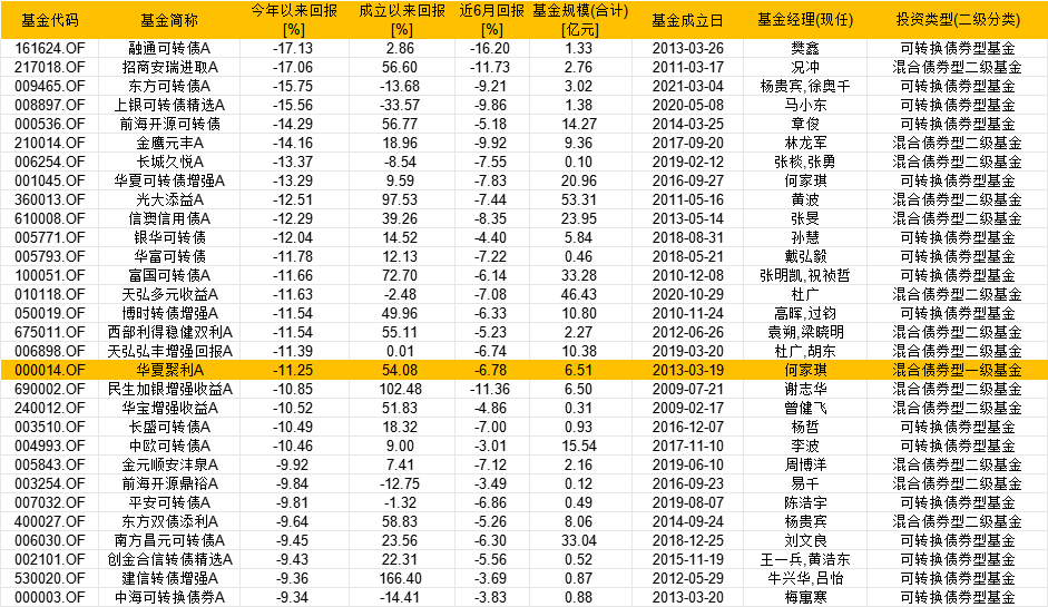 债券基金黑榜TOP32中前5中四只可转债产品 融通可转债A年内回报-17.13%垫底