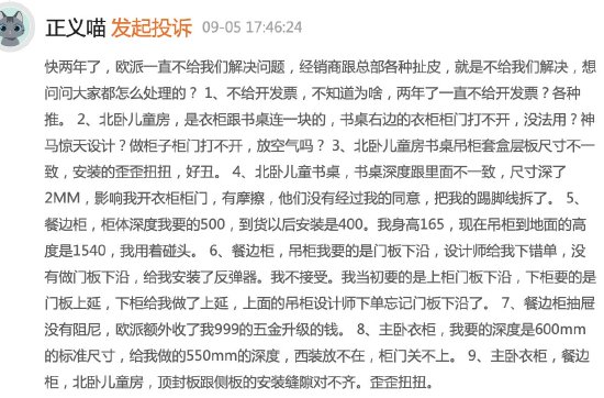 青岛的xx投诉称,自己在xx找了欧派家居进行装修。但是装修完成后,xx却发现了各种问题......
