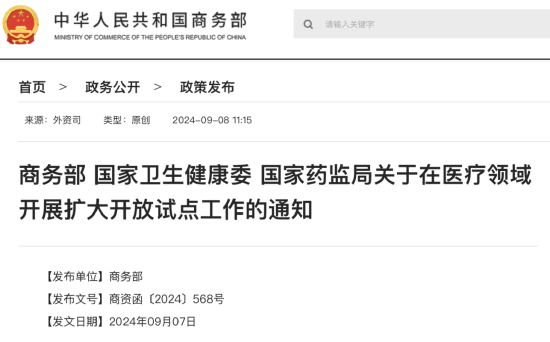 9月8日,据商务部官网,商务部、国家卫生健康委、国家药监局发布关于在医疗领域开展扩大开放试点工作的通知(以下简称“通知”),拟在医疗领域开展扩大开放试点工作。