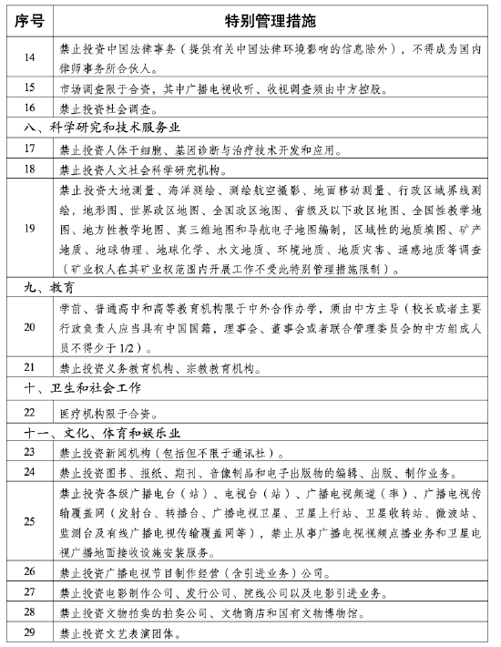 在放宽外资市场准入方面,新版外资准入负面清单将在修订后发布,在全国范围内实现制造业领域限制措施“清零”,推动在电信、互联网、教育、文化、医疗等领域有序扩大开放。