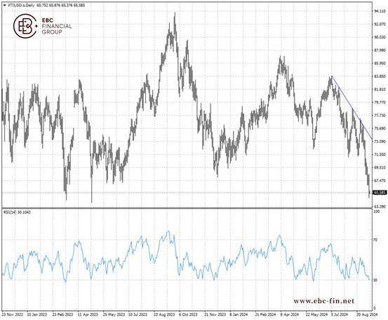 WTI原油可能会一路下跌至74美元,然后在进入相对强弱指标的超卖区域后筑底。另一方面,下行趋势线会阻碍潜在反弹幅度。