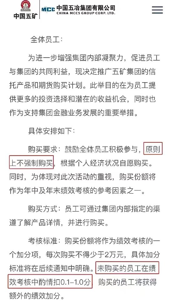 9月12日,一条信托传闻在朋友圈广为流传,据传闻称,中国五冶集团发文,鼓励全体员工集体购买集团信托产品,原则上不强制购买,但不购买的员工绩效考核扣分,购买了的员工绩效考核加分。