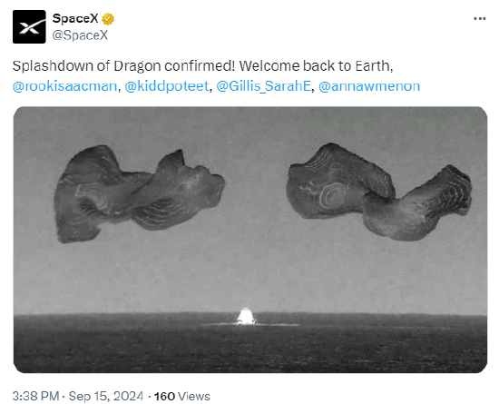 北京时间9月15日,SpaceX在社交平台发文宣布,执行“北极星黎明号”任务的“龙”飞船成功溅落在美国佛罗里达州海面。此前,“北极星黎明号”太空行走任务完成,这是商业宇航员首次从商业航天器上完成太空行走。