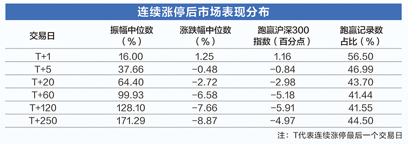 从整体来看,连续涨停股高波动高回撤风险不容忽视。数据显示,个股连续涨停后次日振幅中位数达到16%,5日振幅中位数接近38%,60日振幅中位数接近100%,250日中位数超过171%。