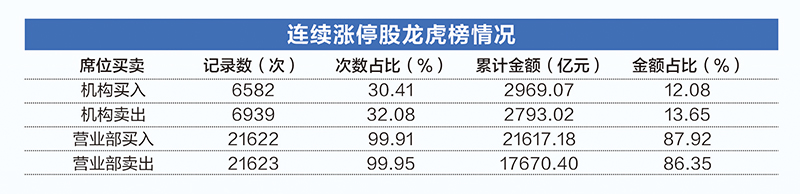也就是说,只要有连续涨停的个股,其龙虎榜几乎百分之百会出现营业部。而从累计金额来看,营业部的交易也占了绝大部分,买入卖出累计金额占比均超86%。