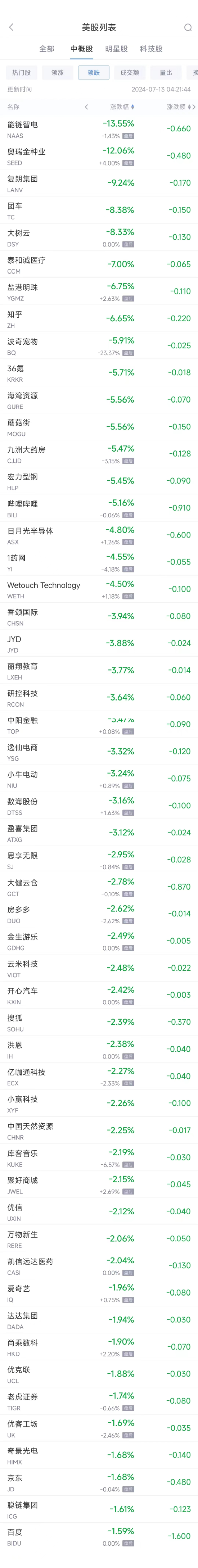 下跌股当中(按市值降序排列),京东跌1.68%,百度跌1.59%,日月光半导体跌4.80%,理想汽车跌0.61%,富途控股跌0.33%,满帮跌0.96%,唯品会跌0.84%,哔哩哔哩跌5.16%,爱奇艺跌1.96%。