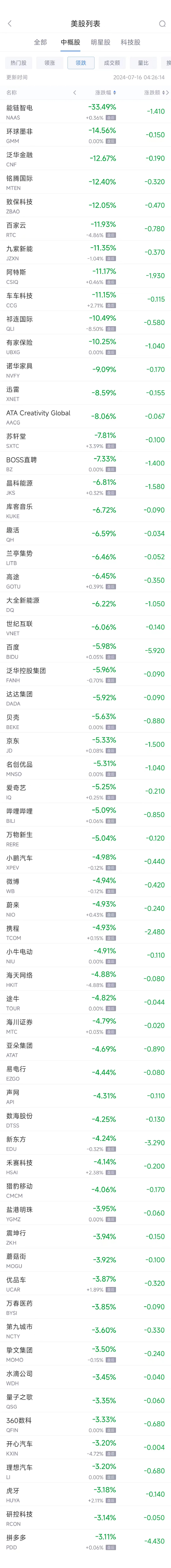 下跌股当中(按市值降序排列),台积电跌1.06%,拼多多跌3.11%,阿里巴巴跌2.03%,京东跌5.33%,百度跌5.98%,携程跌4.93%,中华电信跌0.27%,日月光半导体跌1.18%,腾讯音乐跌1.78%,理想汽车跌3.20%,联电跌1.56%,贝壳跌5.53%,中通跌2.10%,百济神州跌2.90%,新东方跌4.25%,华住酒店集团跌3.08%,蔚来跌4.83%,富途控股跌1.40%,满帮跌1.64%,BOSS直聘跌7.33%,小鹏汽车跌5.03%,唯品会跌2.91%,哔哩哔哩跌5.09%,名创优品跌5.29%,极氪跌2.58%,爱奇艺跌5.25%,汽车之家跌2.91%,360数科跌3.33%,慧荣科技跌1.08%,亚朵集团跌4.64%,雾芯科技跌2.49%。