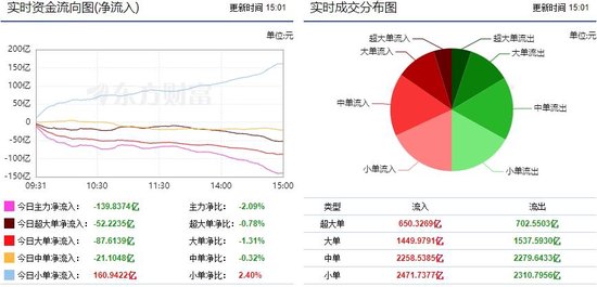 从两市主力资金流向来看,截止收盘,沪深两市主力资金呈现大幅净流出的状态,两市共流出139.8374亿元。其中,超大单净流出52.2235亿元,大单净流出87.6139亿,中单净流出21.1048亿元,小单净流入160.9422亿元。
