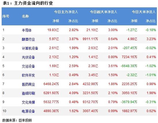 从两市行业板块资金流向来看,半导体行业获主力资金净流入19.83亿,酿酒行业获主力资金净流入5.97亿,计算机设备板块主力资金净流入2.61亿,光伏设备板块主力资金净流入2.13亿,交运设备板块主力净流入1.69亿。