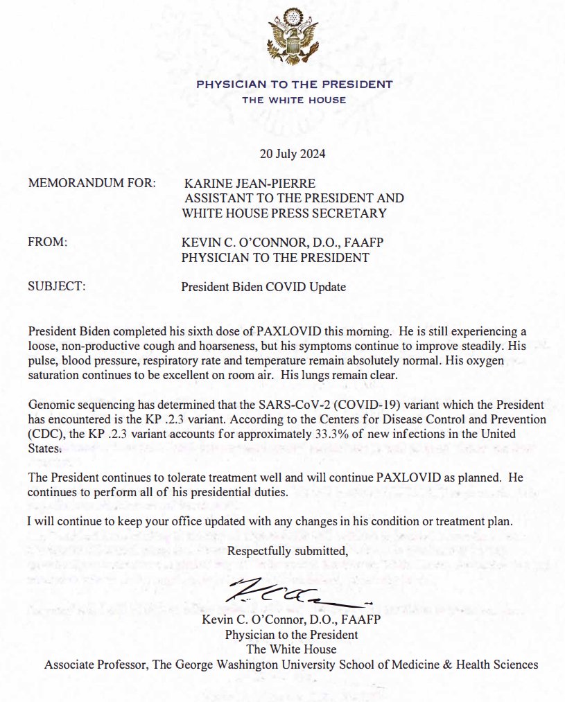 美国白宫医生:拜登感染的是新冠KP.2.3变种 症状持续改善 将继续履行所有总统职责