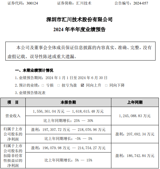 汇川技术2024年上半年预计净利19.73亿-21.81亿 新能源汽车业务收入同比快速增长