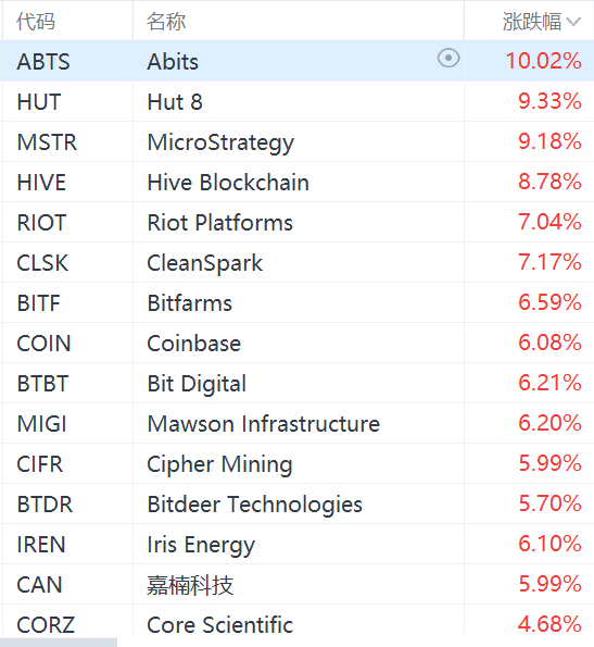 比特币突破68000美元/枚,带动美股市场区块链概念股集体走强。其中,Abits涨超10%,Hut 8、MicroStrategy涨超9%,Hive Blockchain涨超8%,Riot Platforms、CleanSpark涨超7%,Bitfarms、Coinbase、Bit Digital涨超6%,嘉楠科技涨近6%。