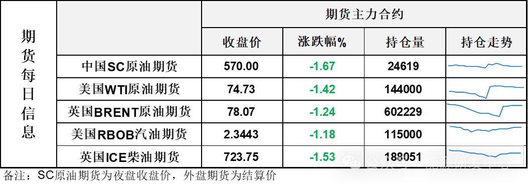 【1】WTI主力原油期货收跌1.08美元,跌幅1.42%,报74.73美元/桶;布伦特主力原油期货收跌0.98美元,跌幅1.24%,报78.07美元/桶;INE原油期货收跌1.67%,报570元。