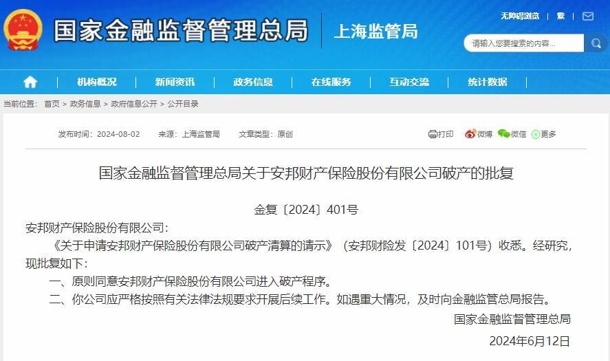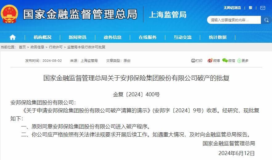 8月2日,国家金融监督管理总局披露的两则批复显示,原则同意安邦保险集团股份有限公司、安邦财产保险股份有限公司进入破产程序。