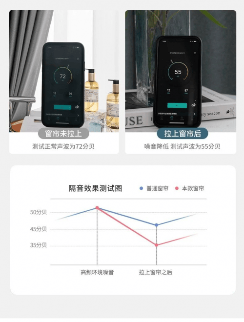 爱漫时睡眠窗帘采用了独特的物理结构,运用了特殊工艺提升窗帘的隔音、降噪效果。其面料克重是市面上同类产品的3倍,拥有自主研发的专业吸音结构,双面吸音与遮光层构成了5层立体结构,室内噪音可控制在30分贝以内,遥遥领先市场上的普通窗帘。同时,睡眠窗帘还经过了高温高压杀菌除螨处理,保证每一扇出厂窗帘的洁净和无害。关上睡眠窗帘,室内与室外空间将被分隔开来,达到99.9%遮光度的一级遮光标准和卓越隔音效果为人们筑起了一道温柔的屏障,有效隔绝外界的喧嚣与纷扰。爱漫时睡眠窗帘赋予了家居生活以健康的睡眠力量,让人们在高质量的睡眠中醒来,以最佳的情绪与精神状态迎接每一个清晨。