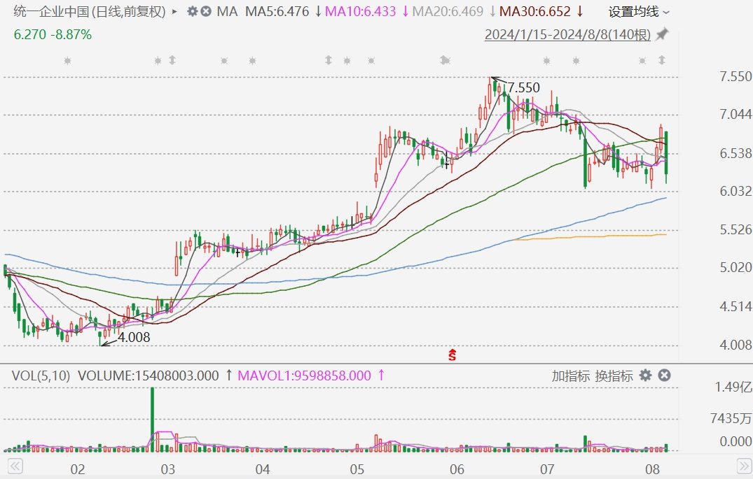 统一企业中国(0220.HK)盘中大跌超10%至6.15港元。消息面上,公司昨晚公布了超预期的中期业绩,其中销售及纯利分别增长6%及10%。但值得注意的是,管理层因为次季增长放缓以及见到7月至8月竞争加剧,认为年初制定的2024年全年销售增长8%-12%的目标可能较难达成,因此审慎地将销售增长目标下调至中至高个位数(5%-8%)。业绩公布后,麦格理下调统一目标价至7.8港元,并下调2025及26年纯利预测,评级为“跑赢大市”。