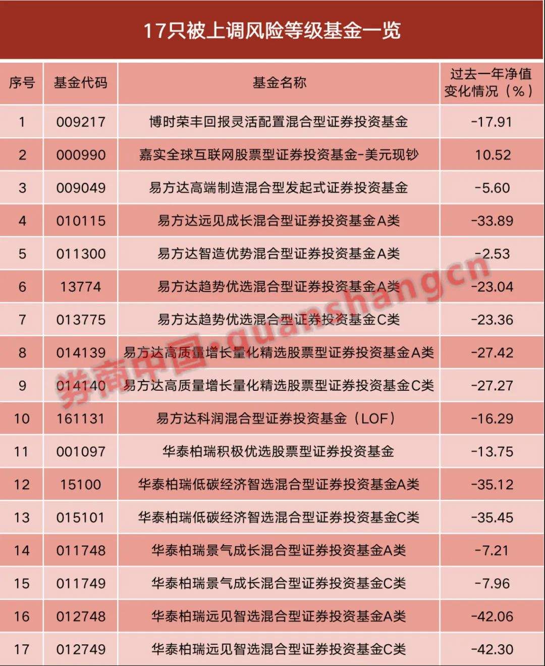本次被调高风险等级的17只基金,过去一年平均跌幅超过了20%,个别产品跌幅超过了四成,业绩收正的仅有嘉实全球互联网一只产品,涨幅为10%,但在此区间内最大回撤也有20%。