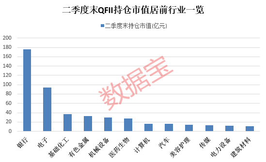 从分行业来看,12个行业的QFII持仓市值超10亿元,其中银行、电子、基础化工、有色金属行业的QFII持仓市值较高,分别达176.33亿元、93.52亿元、36.48亿元和32.84亿元。