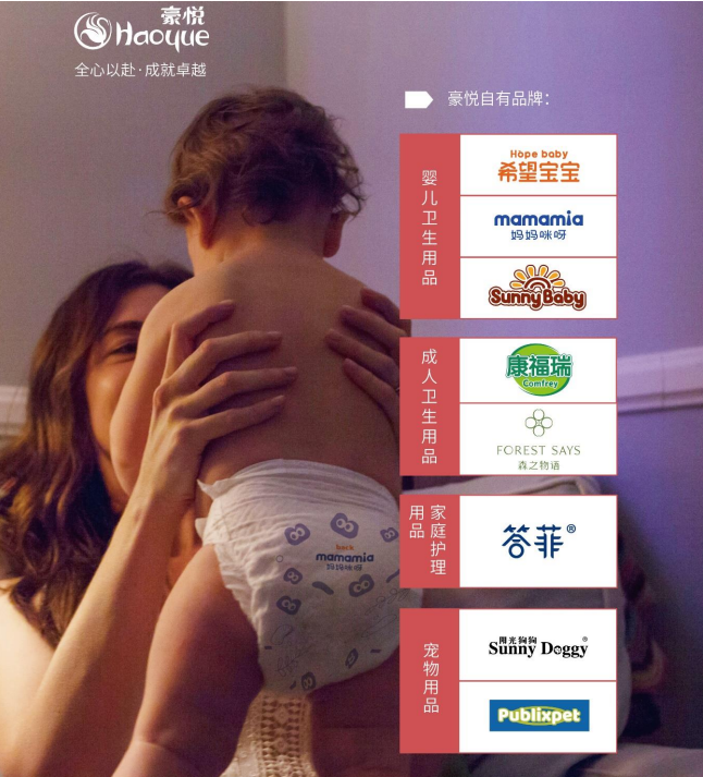说起豪悦护理,消费者可能会有些许陌生,但若说起其代工的品牌花王、尤妮佳、BabyCare等母婴品牌或更为令消费者熟知。豪悦护理主要从事妇、幼、成人卫生护理用品的研发、制造与销售业务,产品涵盖婴儿纸尿裤、成人纸尿裤、经期裤、卫生巾、湿巾等一次性卫生用品,主要有婴儿卫生用品、成人卫生用品及其他卫生用品等产品。