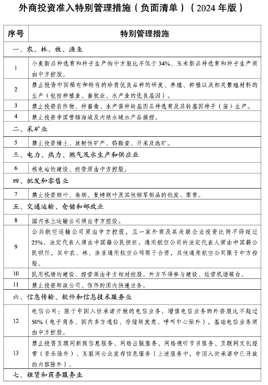 同日,据国家发改委官网,经党中央、国务院同意,国家发展改革委、商务部于2024年9月8日发布第23号令,全文发布《外商投资准入特别管理措施(负面清单)(2024年版)》,自2024年11月1日起施行。《外商投资准入特别管理措施(负面清单)(2021年版)》同时废止。