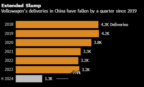 中国消费的低迷加上市场迅速转向电动汽车使大众汽车的主战场变成了软肋。该公司8月将第二季经营毛利的下降部分归咎于中国放缓。大众汽车上半年在大陆的交付量因来自比亚迪等本土制造商的激烈竞争下降了7.4%,和2019年相比更是大幅减少24%。