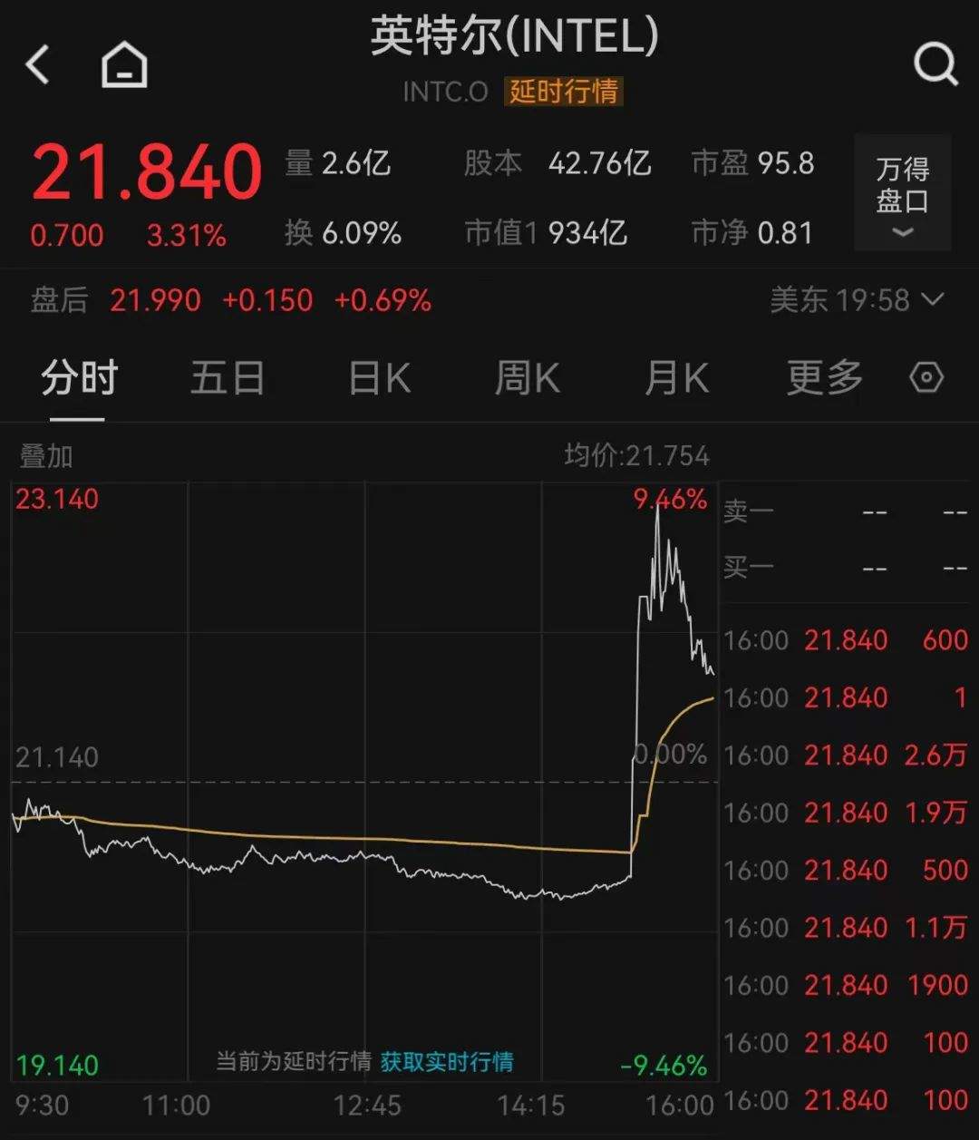 昨日晚间,英特尔开盘小幅下跌,临近收盘股价直线拉升,一度触发停牌,盘中最高涨9.46%,收盘涨幅回落至3.31%。